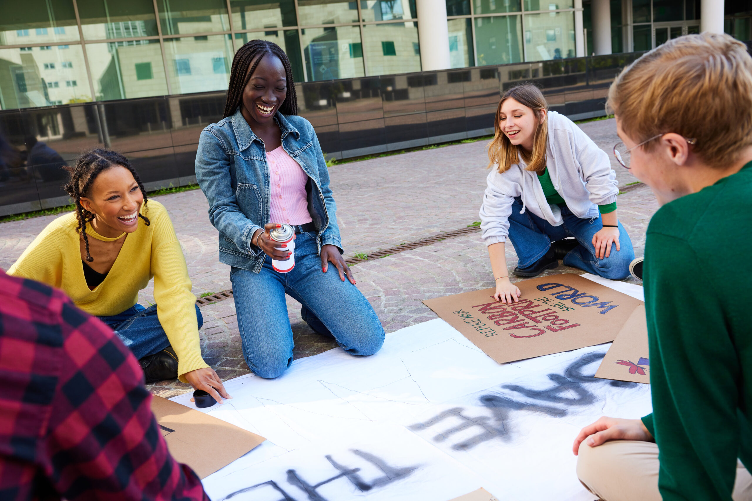 Diverse group of teen students laughing and preparing banners with spray paint for climate change protest